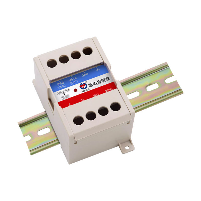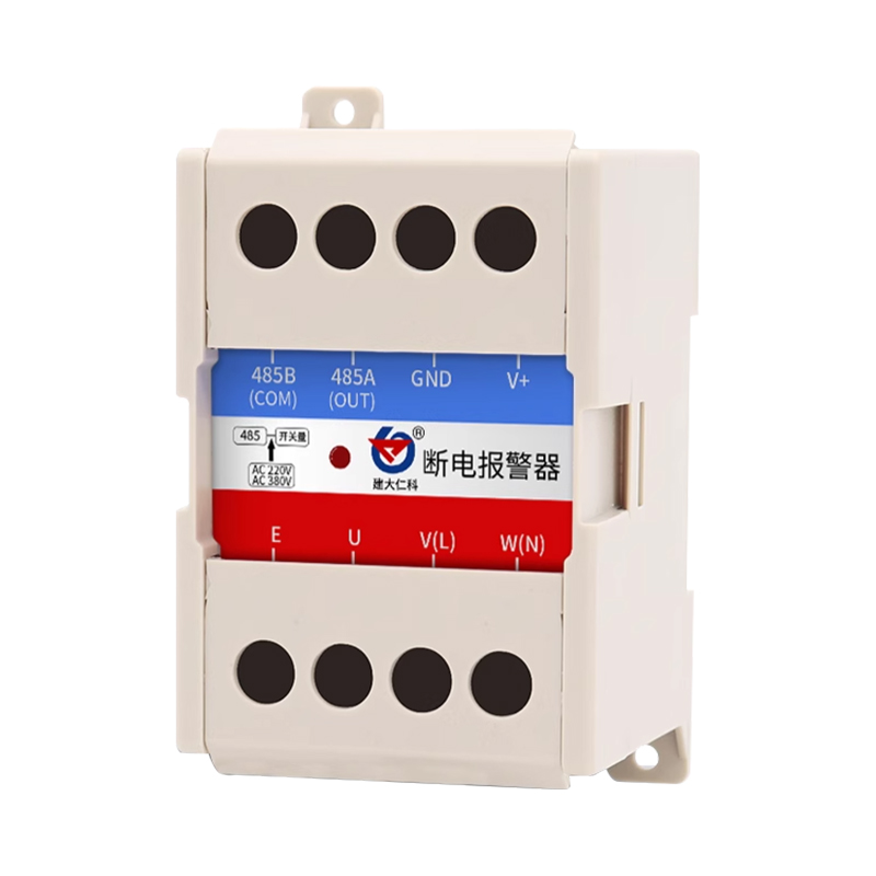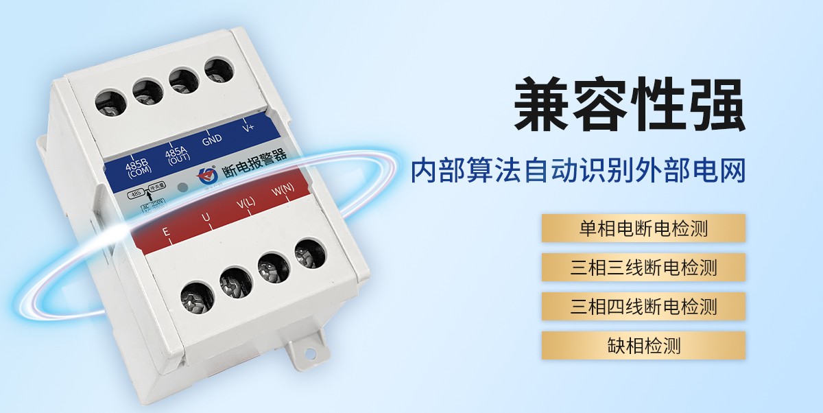 该报警器能够进行单相电断电检测,三相三线、三相四线断电及缺相检测。报警信号可选485输出,亦可选开关量干接点输出。可直接接入现场的PLC、工控表、组态屏或组态软件。设备采用卡轨式外壳,即可壁挂安装也可现场安装于标准DIN35mm导轨。