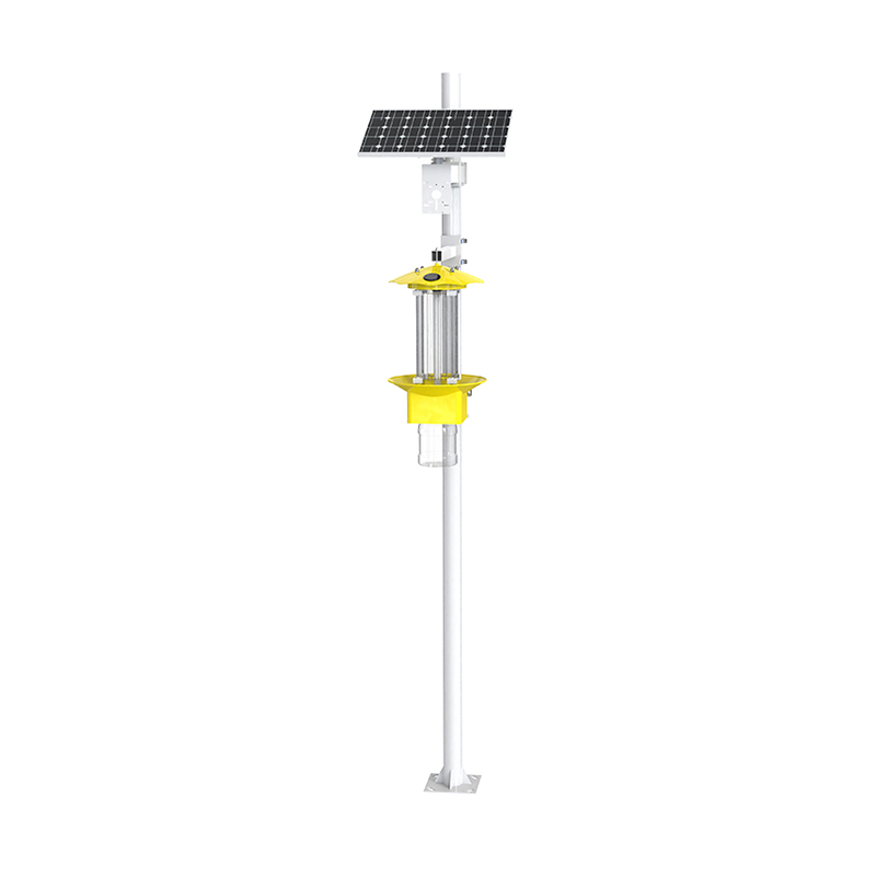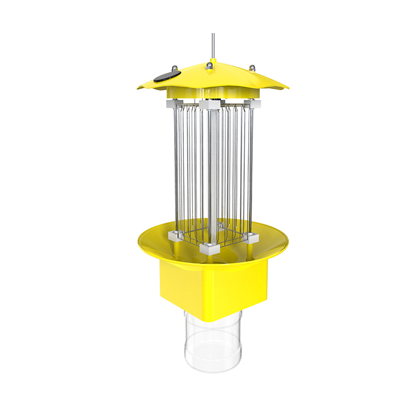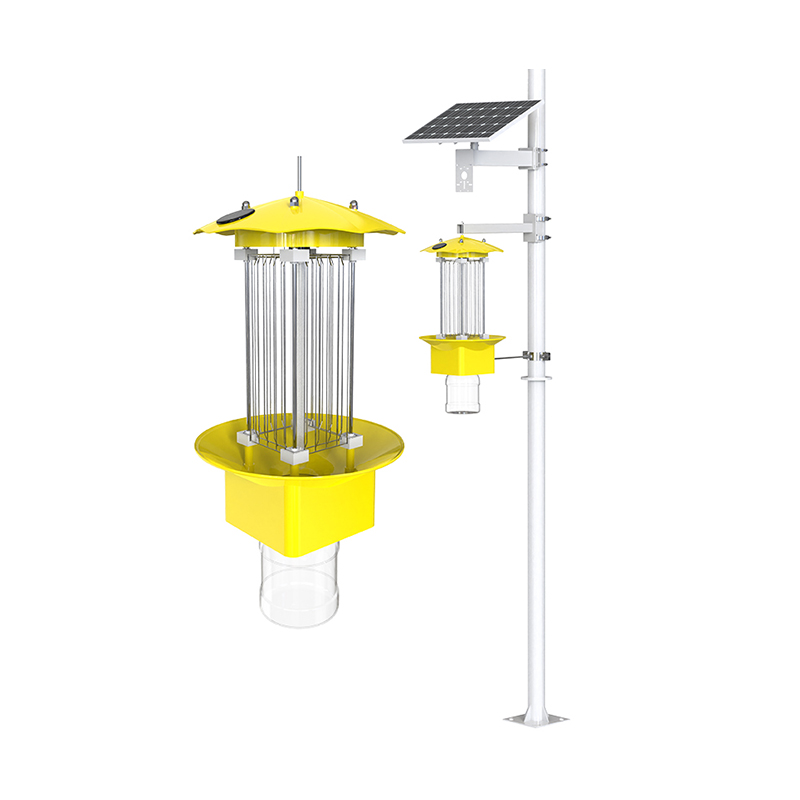 频振式杀虫灯是一款灭虫器械,利用光波引诱害虫成虫扑灯,外配以频振高压电网触杀。 在杀虫灯下装有接虫盒,使之风干、脱水,达到杀虫的目的。该设备以太阳能电池板为电源,白天储存电源,晚上为杀虫灯提供电源,引诱害虫扑向灯源。