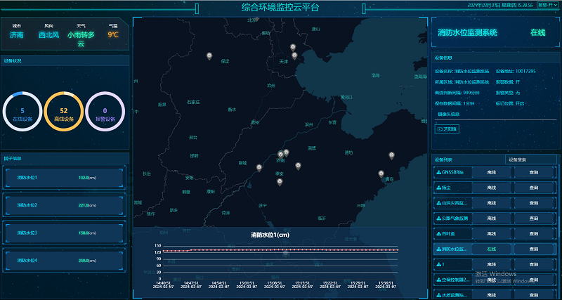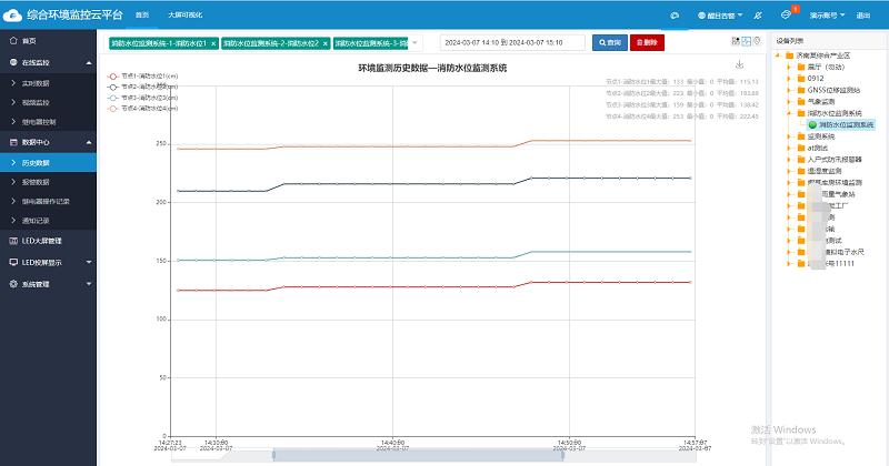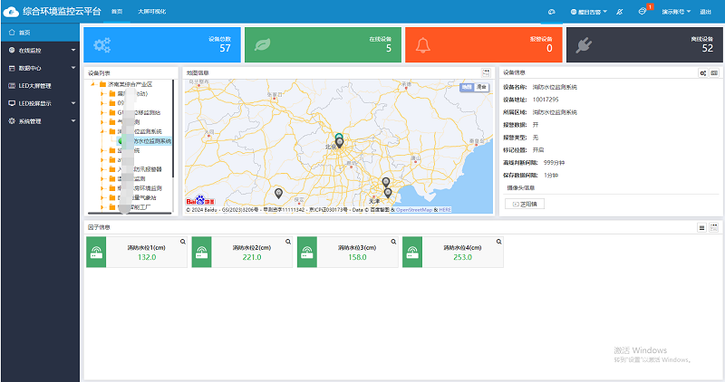 免费赠环境监控云平台,可24小时在线监测查看水位数据,若有报警情况平台数据会变红并有报警声音,同时可向多名责任人通过微信、短信、电话振铃、邮件等远程告警方式及时预警,还可记录历史数据和报警数据,拥有设备定位、视频监控、账号分级、大屏可视化等功能。