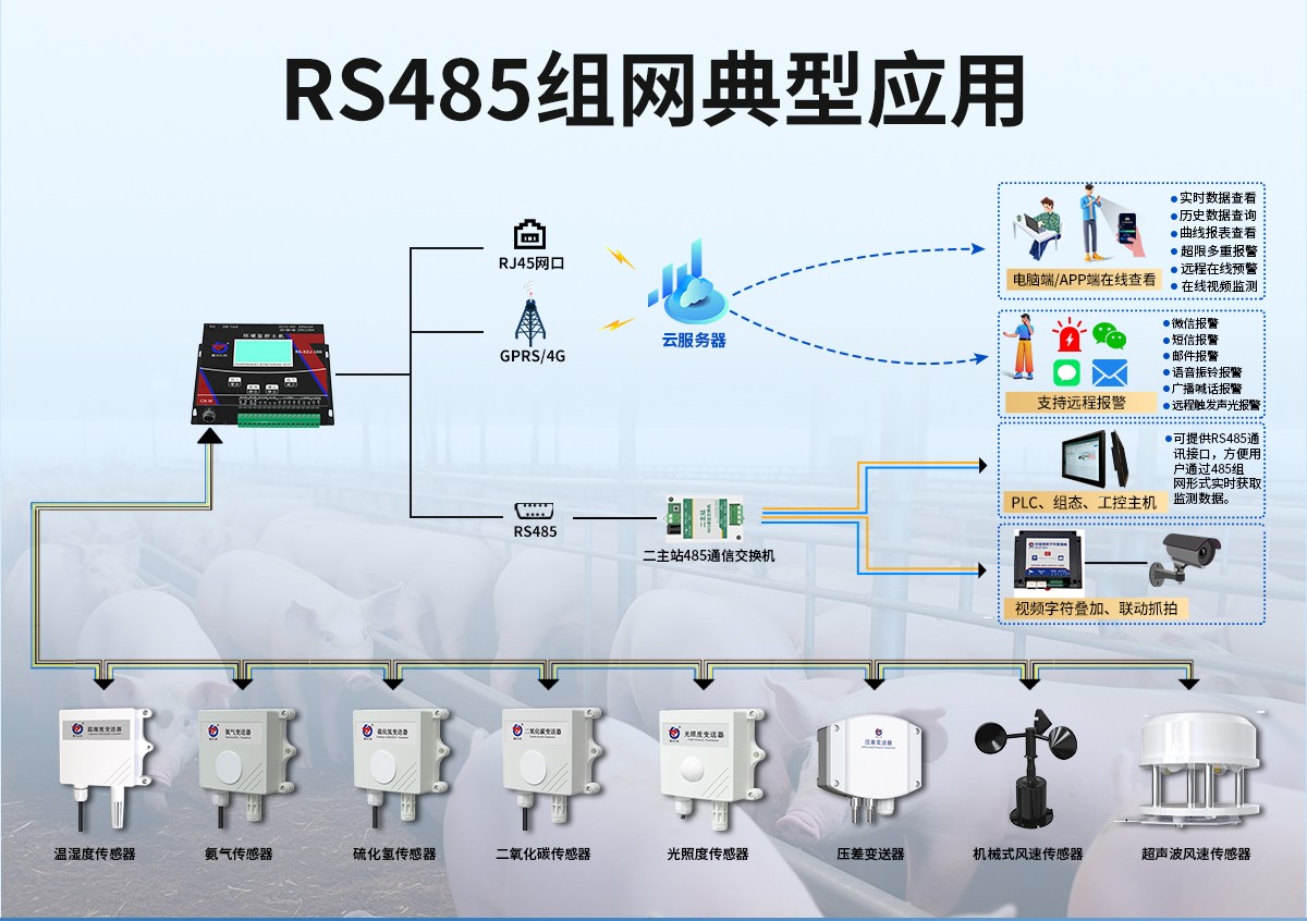 智慧养殖环境监控系统,采用RS485组网通信形式,系统可扩展“温湿度、氨气、硫化氢、二氧化碳、光照强度、风速、压差”等多种传感器,依托我司免费提供的云服务、APP客户端,可实现远程在线监测、数据记录、曲线分析、远程告警、联动控制等多种物联网应用服务。