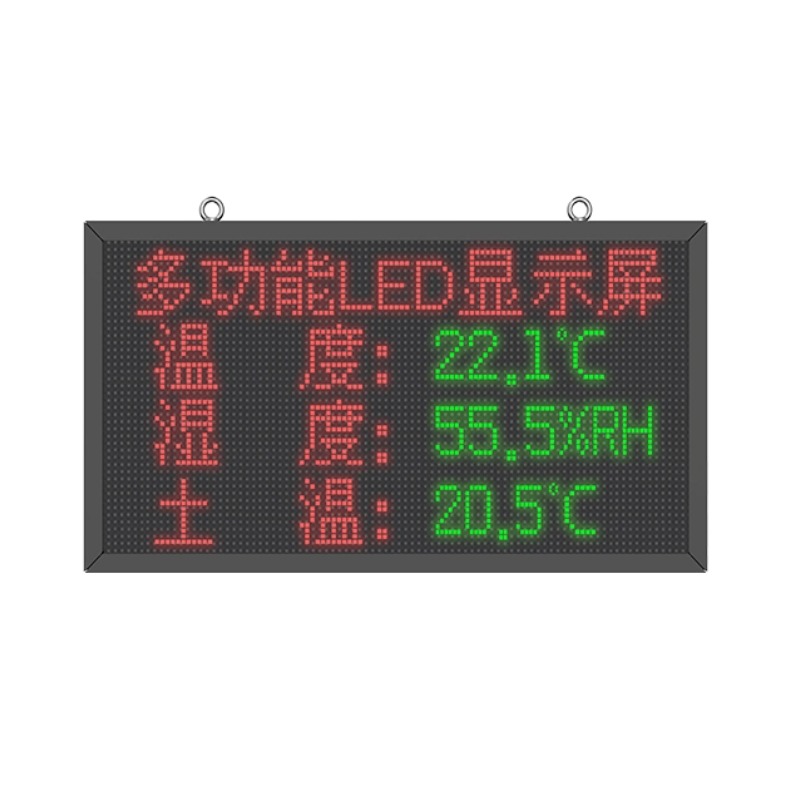 多功能 LED 显示屏,该设备可以实时显示室内各项监测数据,并 通过 4G 将监测数据上传到云平台,满足用户的远端数据监测需求。该设备具有 1 路 ModBus-RTU 主站接口,可通过此接口连接我公司 485 传感器,最多接收 32 台传感器数 据;自带 2 路继电器输出,可选配多路,最多可配置 32 个继电器节点,并可进行继电器远程控制及继电器实时状态采集。